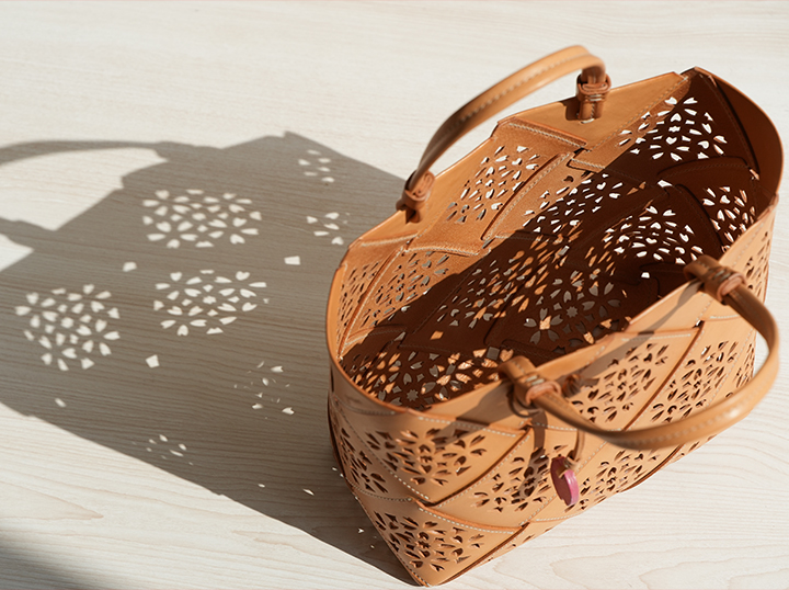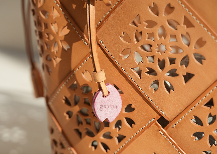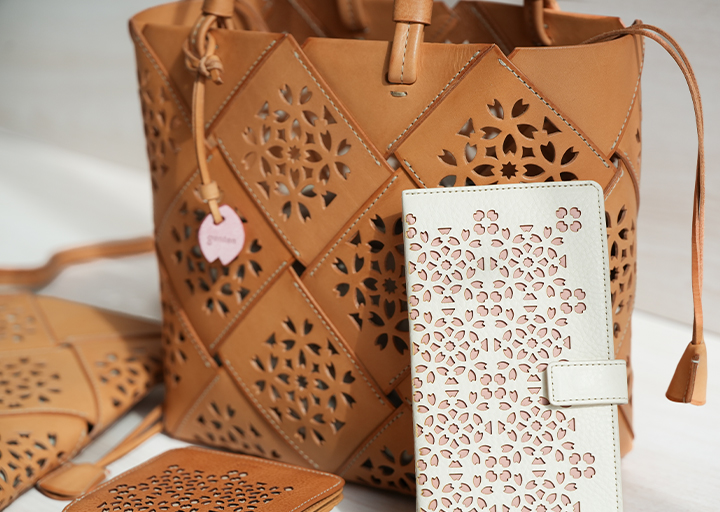 小物は、バッグよりも柄を小さく繊細に施し、桜の儚さを表現。角にあしらった、ふっくらとした蕾の形もアクセントになっています。