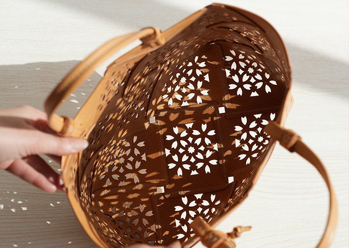 細かな表現のため、柄のカッティングはレーザーで行っています。レーザーカット特有のシャープで引き締まったコバ(切断面)と独特の陰影が、奥ゆきのある表情を生んでいます。