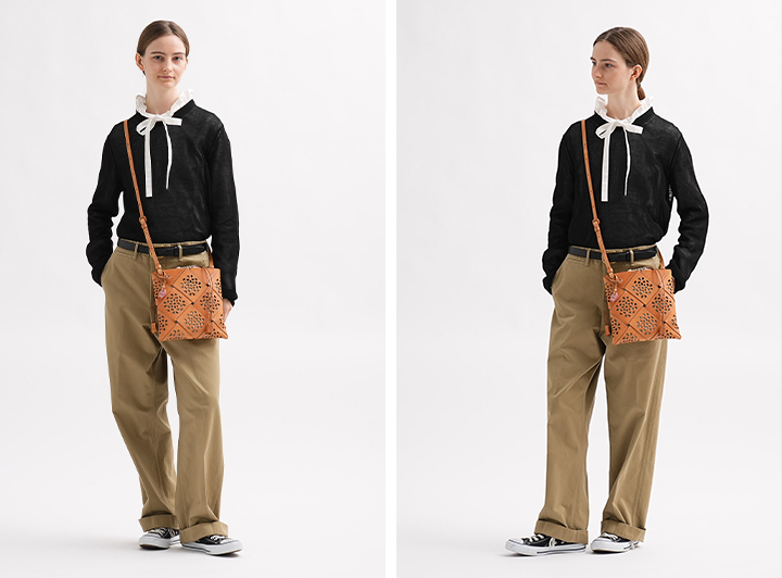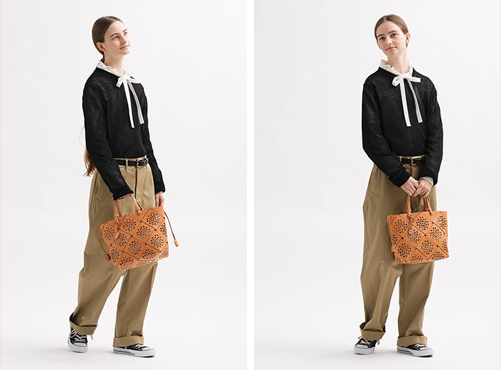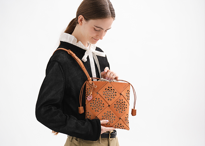 カラーは、どんな装いにも寄り添いつつ“革らしさ”も楽しめる、ヌメベージュ。軽やかさのある色合いが、春らしいカッティングデザインを一層引き立てます。