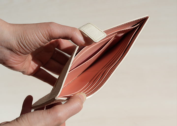 お札を折らずに収納でき、それでいながら、かさばらずにすっきりと持てる長財布。スリムなバッグでもおさまりが良く、取り出しもスマートです。