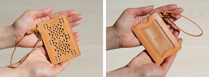シンプルさの中にカットワークが引き立つパスケース。ストラップ付きなのでバッグの中でも見失いにくく安心です。今回、お客様の声を参考にストラップを4cmほど長くしました。取り出しのストレスも軽減され、より使いやすくなっています。