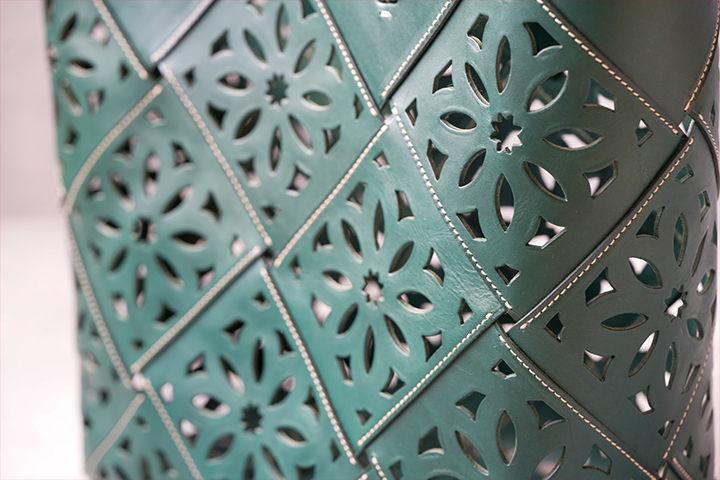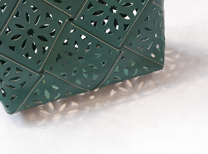 素材を余すところなく使い切れるよう、カットワークを施した革パーツを一つずつ縫い合わせて作るサスカットバスケットは、gentenの哲学と技術が凝縮されたバッグ。