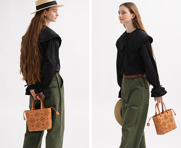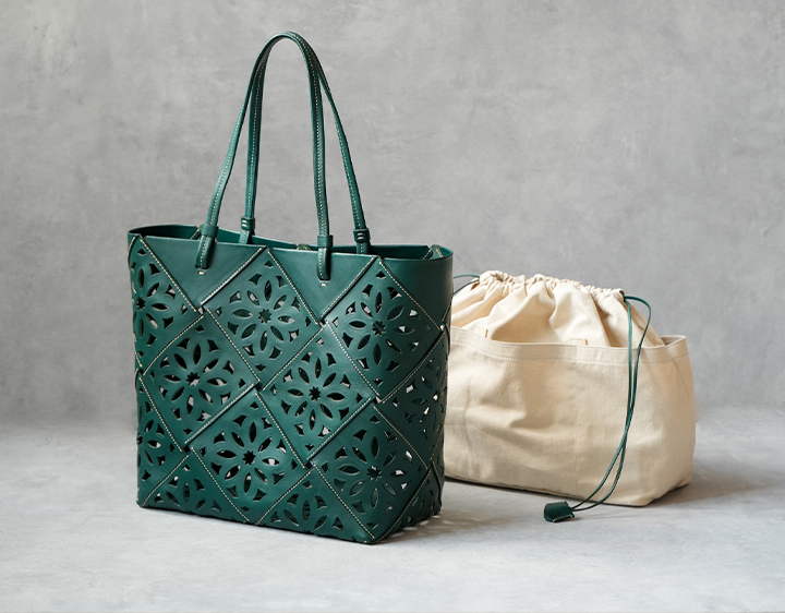 <LL>は、大きなものもしっかり収まる安心のサイズ。日傘や薄手の羽織ものなど春夏の荷物の持ち歩きにも心強い存在です。手に持ってもサッと肩にかけてもスマートな、凛としたシルエット。収納力とスタイルの美しさをあわせ持った型です。