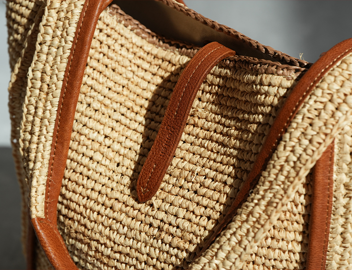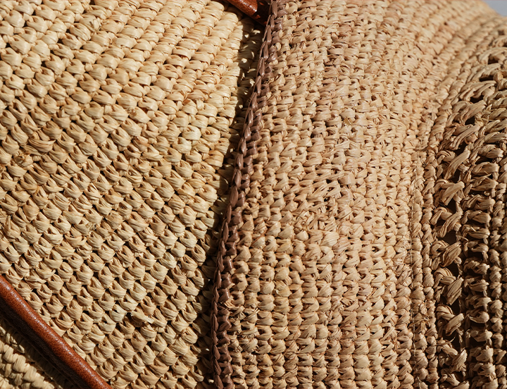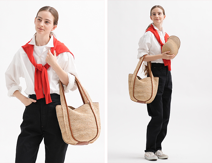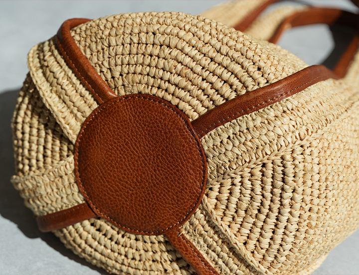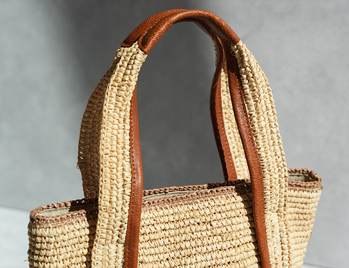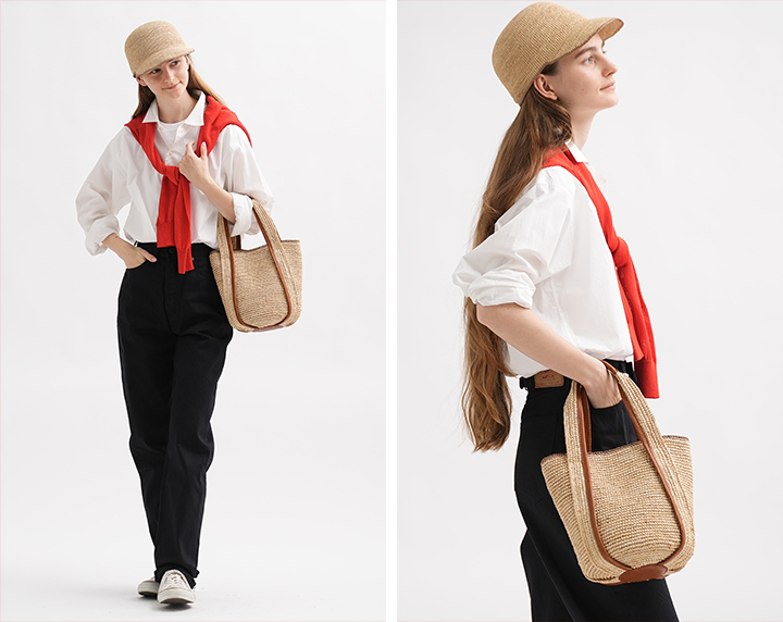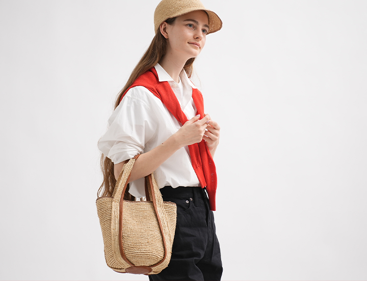 ハンドルは、テープ状に編んだラフィアにすっと革を通すことで縦のラインを強調。ラフィアと革を合わせることで強度が増して擦れの軽減にもつながります。さらに口前には、ラフィアと革との中間色の再生ポリエステル糸でかがりラインを入れたことで、夏のコーディネートに合わせやすく。