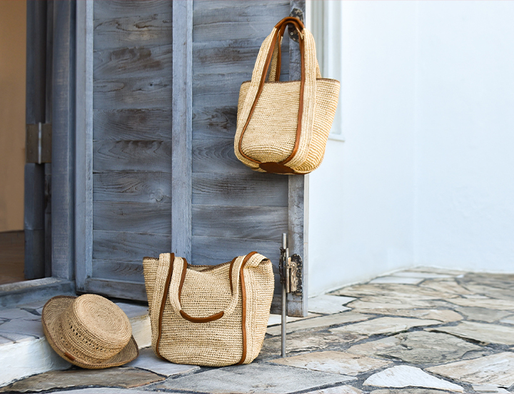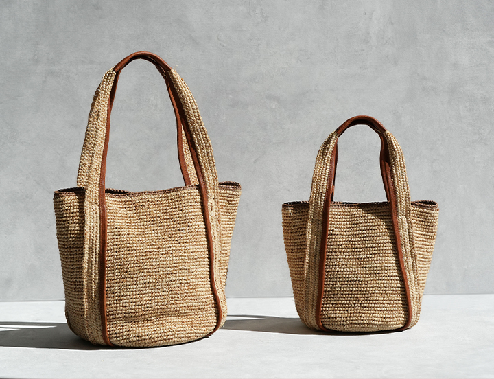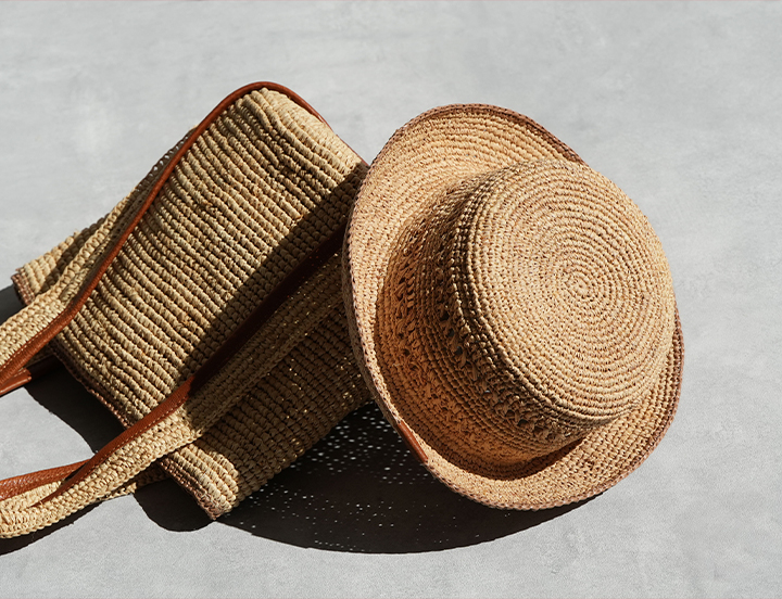 ラフィア椰子の葉を乾燥させることでできる天然繊維、ラフィア。天然の樹脂を含んでいるためしなやかで、細かな細工ができるのが特長です。竹や籐のバッグとはまた違った魅力があり、編み上げたときの美しさは格別。gentenでは、品質の高さに定評があるマダガスカル産のラフィアを選んでいます。