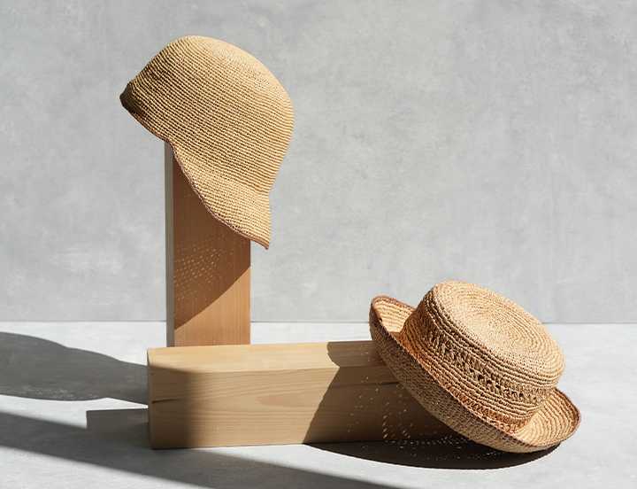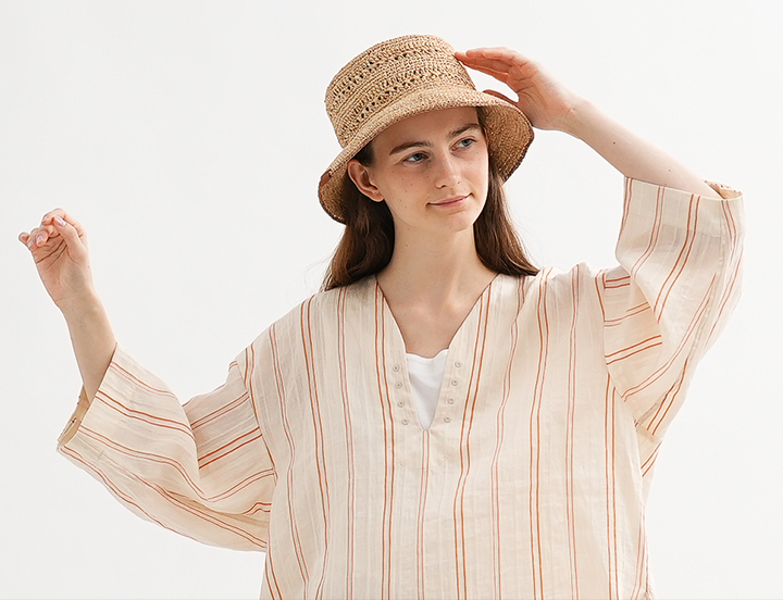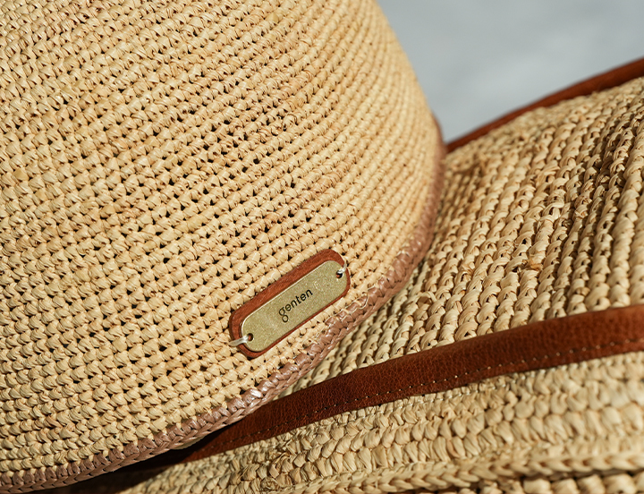 昨年、好評だった形のハットは、クラウンの高さはそのままにデザインを少し変えています。短めのつばがゆるやかに下を向きやさしい印象。カジュアル過ぎず、透かしが涼し気です。つばの縁には、バッグと同様に再生ポリエステル糸でかがりラインを入れ、gentenの革タグを添えてアクセントに。