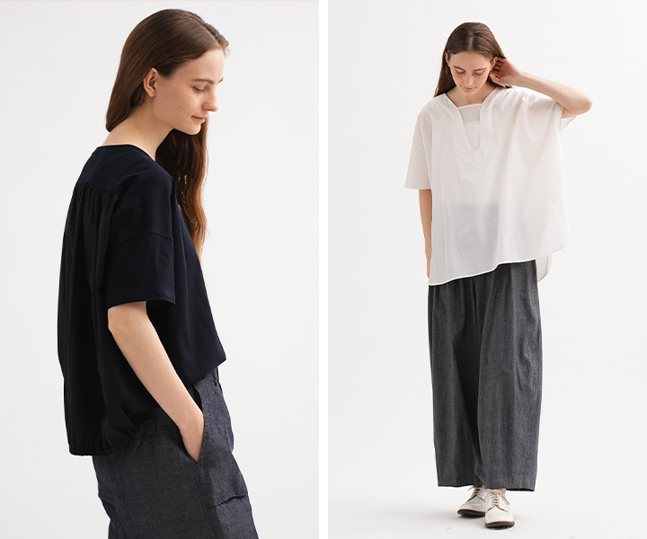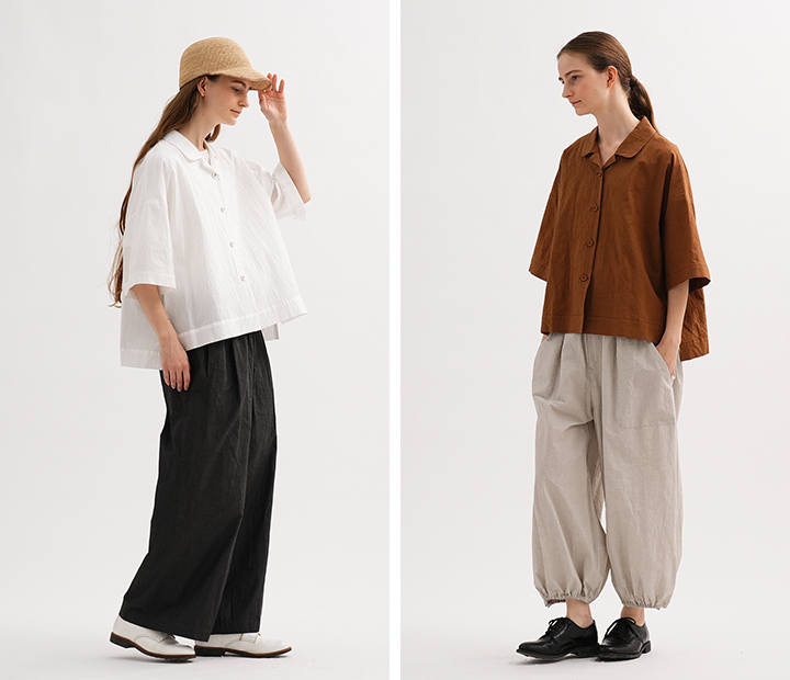写真左:タイプワッシャーシャツ(オフ)28,600円(税込)、コットンリネンギャザーパンツ(チャコール)27,500円(税込)