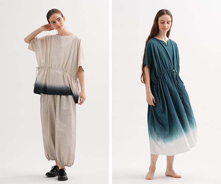ハッとするようなグラデーション染めのブラウスとワンピース。どちらも日本の職人が、手作業で染め上げました。歩くたびに揺れる染め模様は、まるで波が描く曲線のよう。