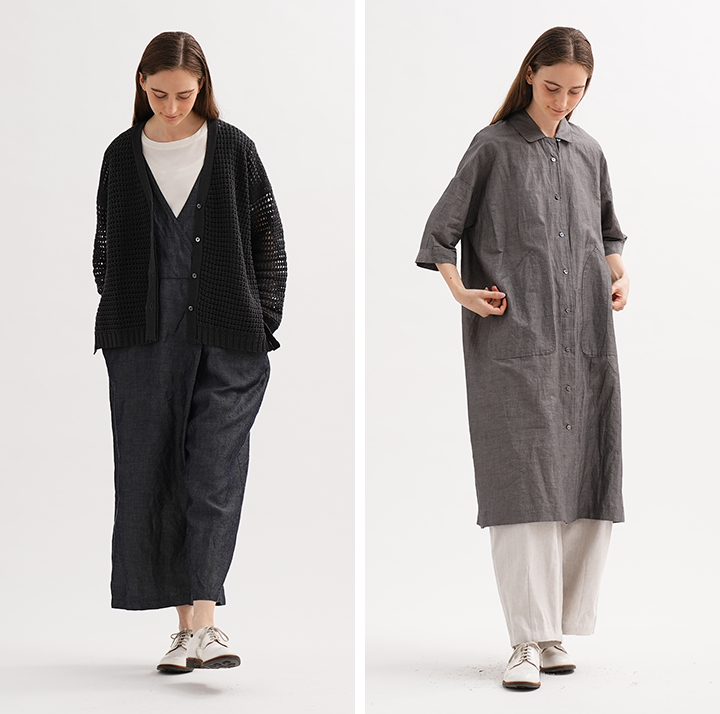 写真左:テンセルリネンオールインワン(ブルー)42,900円(税込)、ギマコットンカーディガン(チャコール)38,500円(税込)