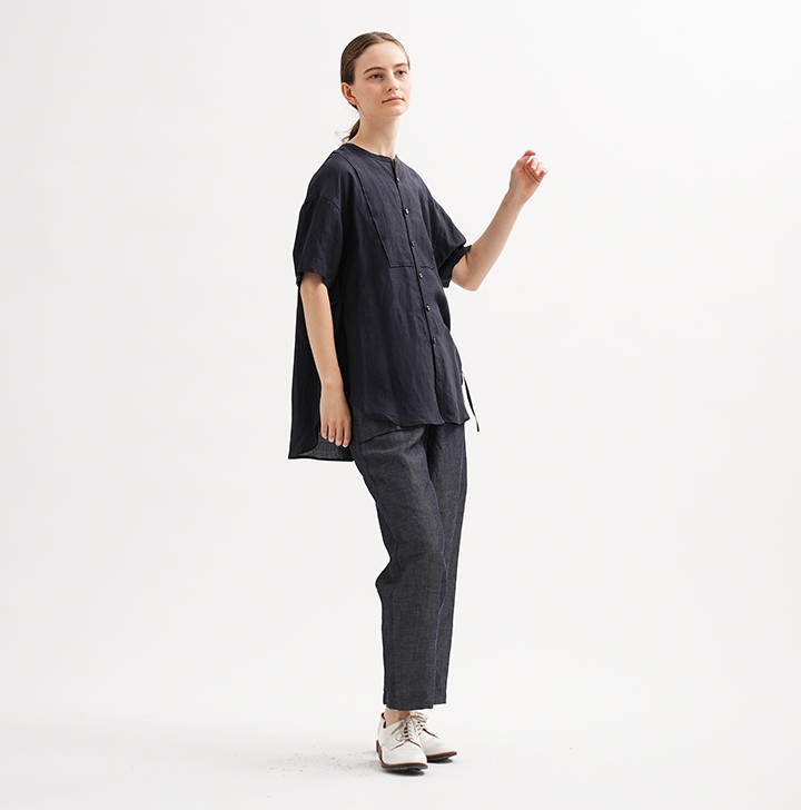 ナチュラルローンシャツ(チャコール)28,600円(税込)、テンセルリネンベイカーパンツ(ブルー)29,700円(税込) ※モデル身長174cm