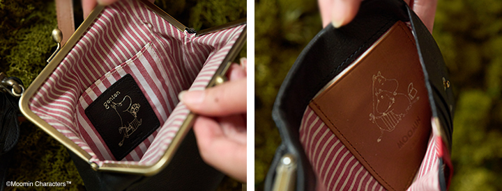 ムーミンママが肌身離さず愛用しているがま口のハンドバッグをモチーフにしたポシェットと財布もでき上がりました。がま口を開けると顔をのぞかせる内装には、ムーミンママのエプロンを連想させるストライプをあしらって。