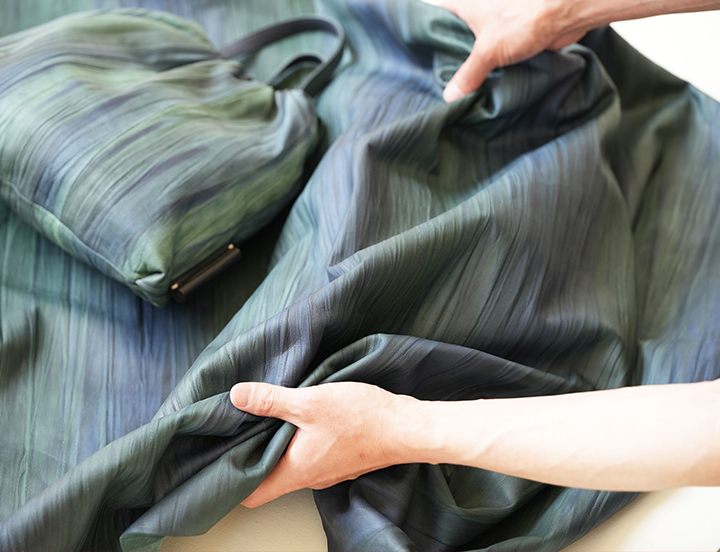 染色の魅力を生かしてデザインはシンプルに。袋状の本体に手提げとショルダーを付けた2WAY仕様に仕立てました。幅広のショルダーが肩にやさしく、フレキシブルに長さの調整ができるので、シーンや装いに合わせて楽しめます。