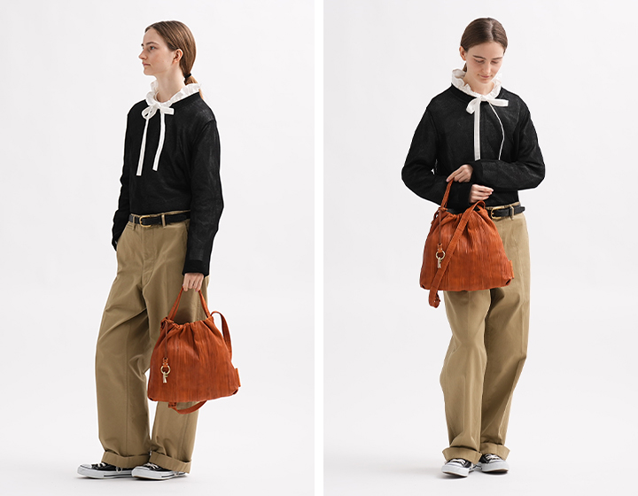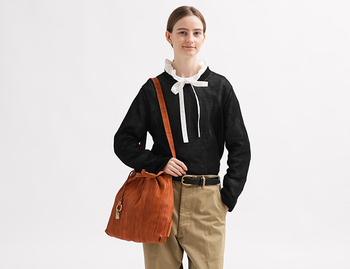 絞り加工を施してあるのでシワが気にならず、革製でありながらコンパクトに折り畳めるのも特徴。サブバッグとして旅先に持っていくのもぴったりです。