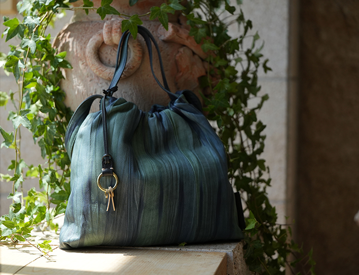 素材を絞って染める。日本に古来より伝わる技法からインスピレーションを得て革に応用した「ベラ ヴィスタ」。一枚一枚、職人が革を絞りながら染め上げる多色仕上げです。