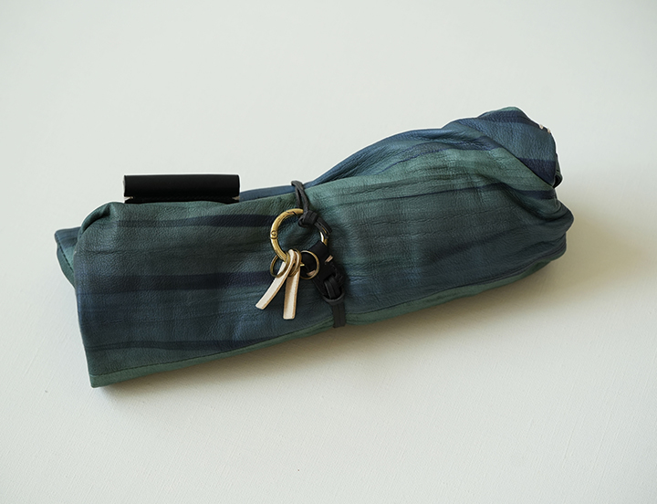 畳むときは、付属のチャームでくるりとまとめて。キーチェーンにもなるリング状のチャームには、革のプレートを2枚付けました。鍵と鍵が触れ合い、音が鳴るのを防ぎます。