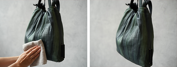 雨や汗ジミに比較的強いので、天候を気にせずお出かけのおともに。染色を施していますが、色落ちしにくいのも大きな魅力です。使うほどに艶が上がり、より立体的で多彩な表情を見せます。