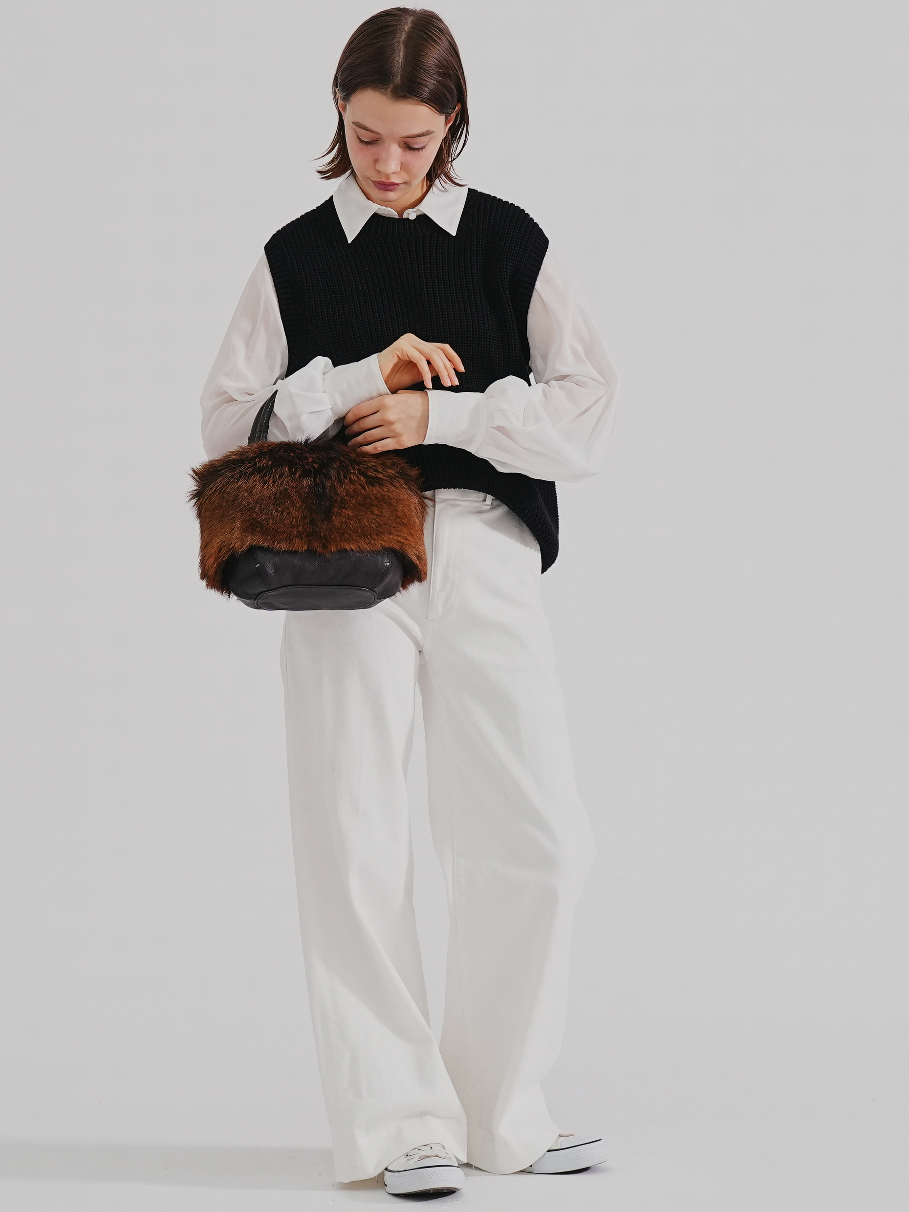 内装背面にはゆとりのあるサイズのファスナーポケットを備え、反対側には2つのオープンポケットを配置。財布やキーケース、小物を仕分けながらスマートに収納できます。ファーの豊かな毛足の存在感に加え、実用性を兼ね備えた大人のバッグです。