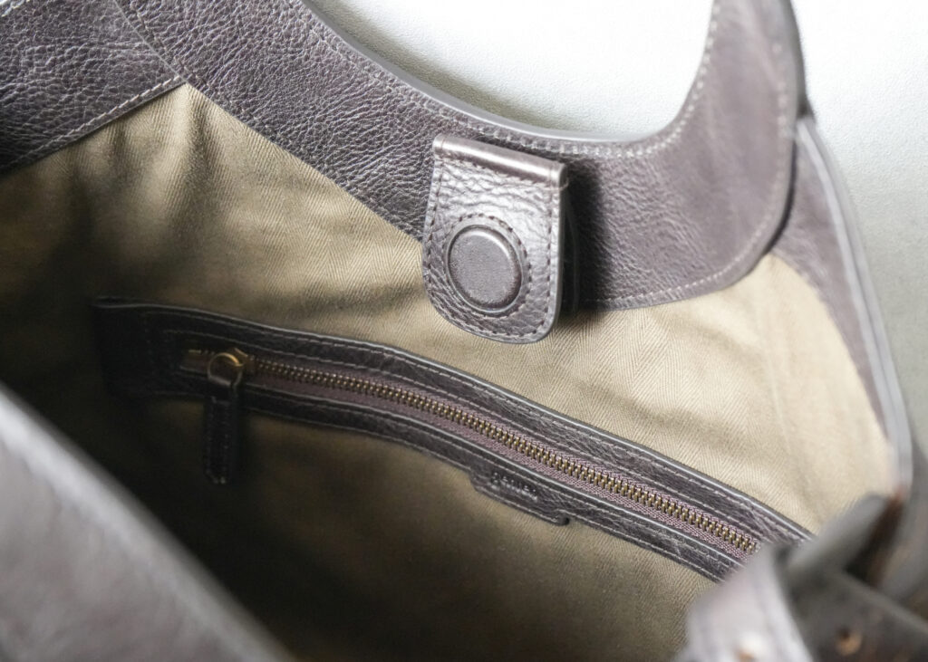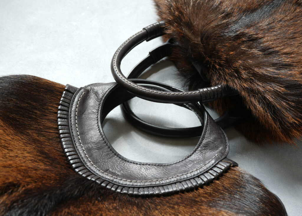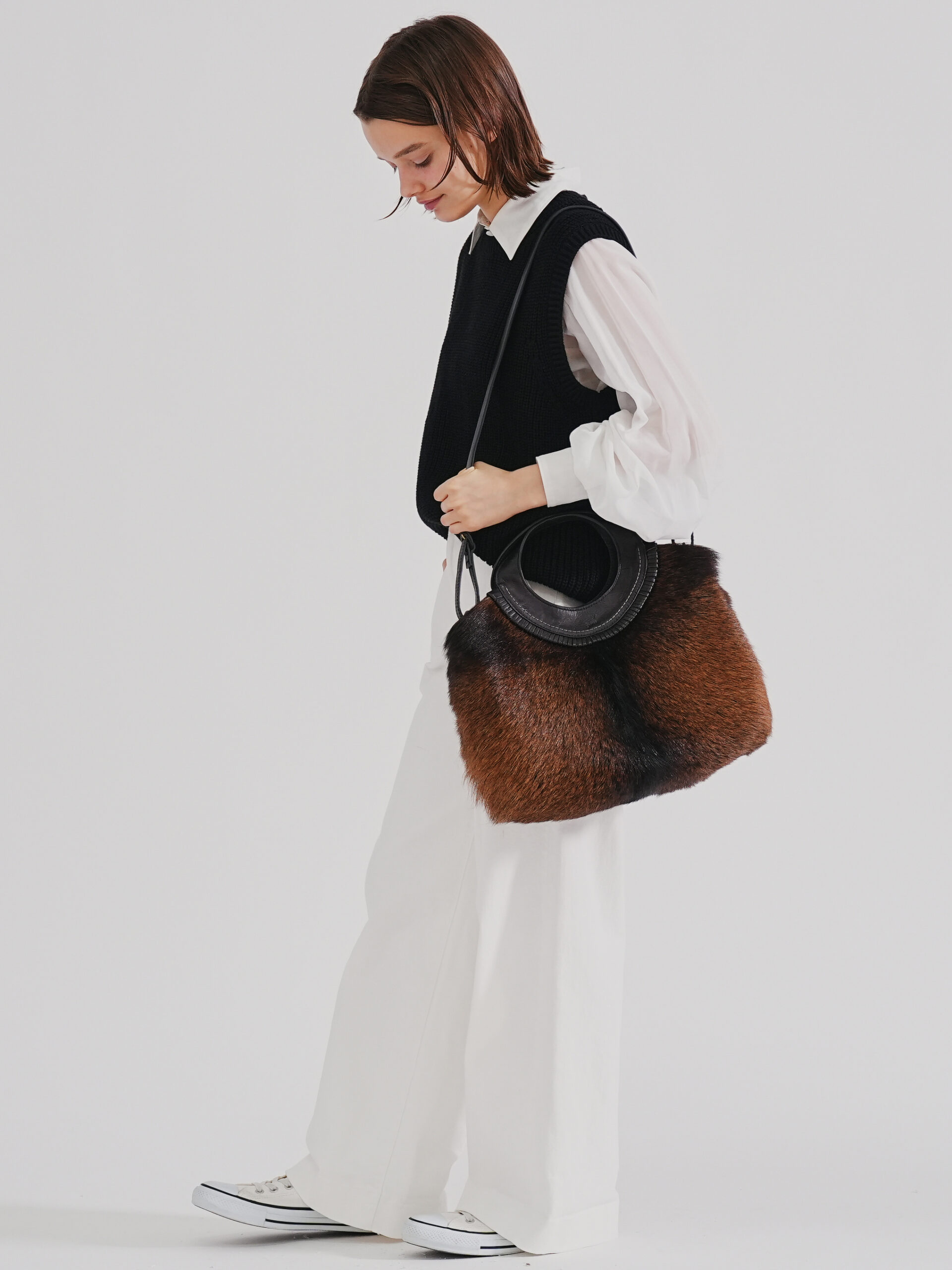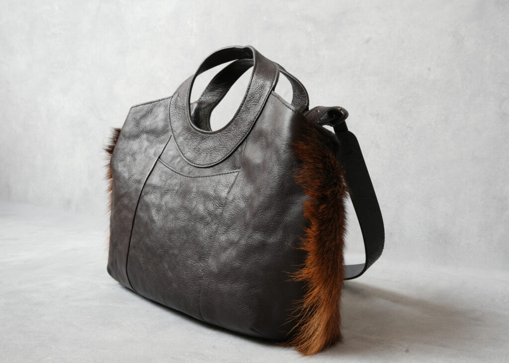ファーと組み合わせる付属部分には、タンニン鞣しの牛革を採用。最初はスモーキーな墨クロですが、使い込むほどに艶が増し、深みを帯びていきます。ファーの存在感と相まって、時間と共に育つ大人のバッグへと変わります。
