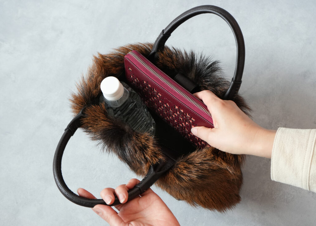 小ぶりなサイズながら、しっかりとマチが取られているため長財布やペットボトルも収められる設計。ファーがぐるりと一周しており、どの角度から見ても存在感を放ちながら、品のある大人の可愛さを纏います。