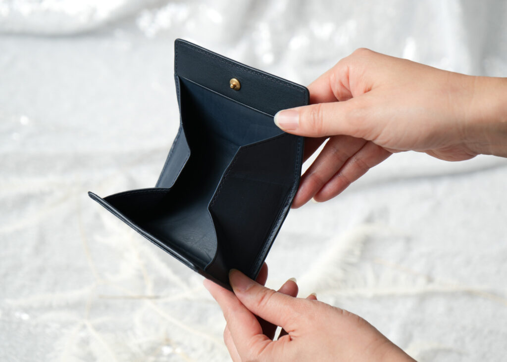ギャルソン型の小銭入れにはカード収納スペースも備え、必要最低限をスマートに持ち運べる設計。