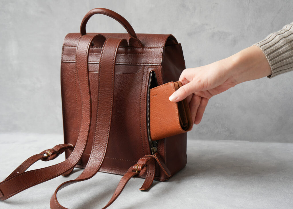 背面に外ファスナーを備え、フラップを開けなくても、財布などの荷物を取り出せる機能性も魅力。