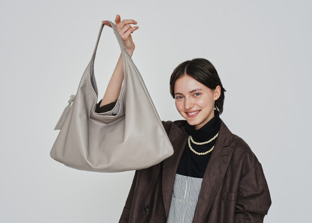 ショルダーでも手持ちでも身体にやわらかく沿う形状。角がないフォルムが肩の負担を和らげ、荷物が多い日でも軽く感じられます。