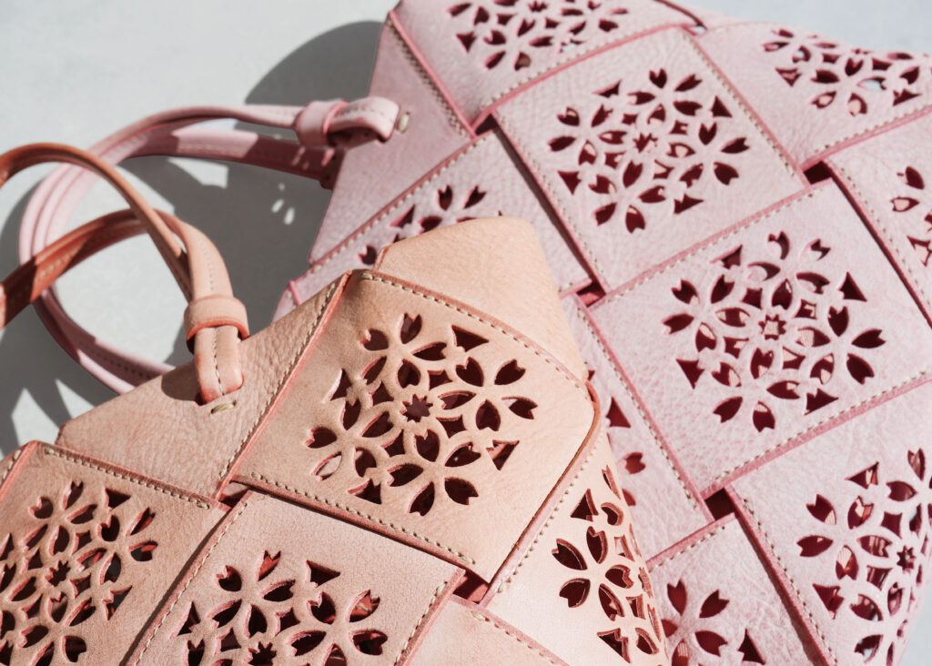 ピンクの革が重なることで、透かしの陰影がより繊細に見え、手元で静かに表情を変えてくれます。
