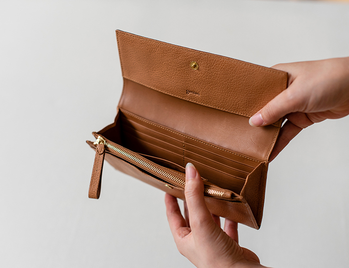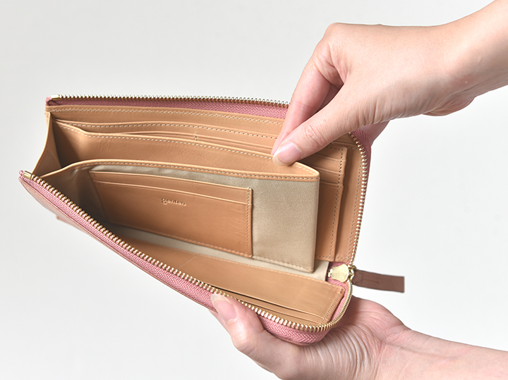 ファスナーを開けると一目ですべてを見渡せて、さっと中身を取り出せるLファスナー長財布。その使い勝手の良さから他のシリーズでも好評をいただいています。