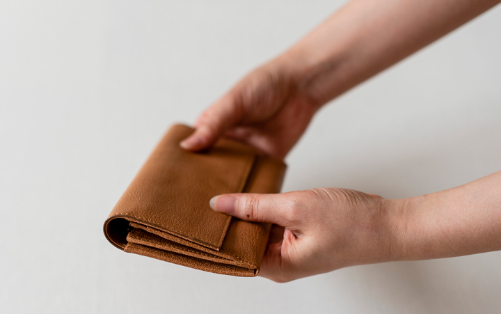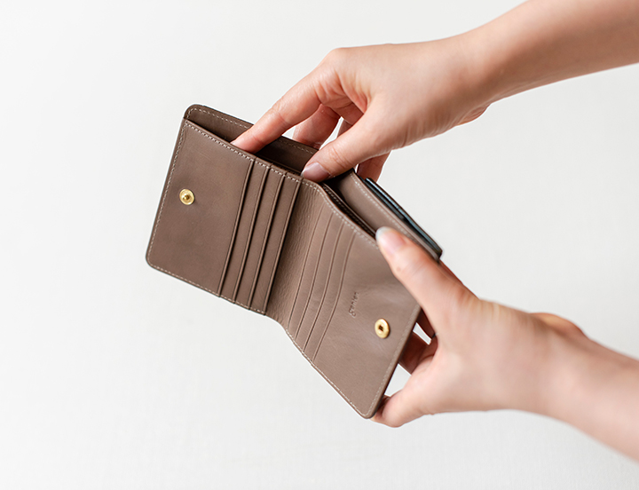 二つ折り財布は、ミニバッグやポケットにもスッと入るコンパクトサイズ。小さいながらも小銭やカードがしっかり入ります。