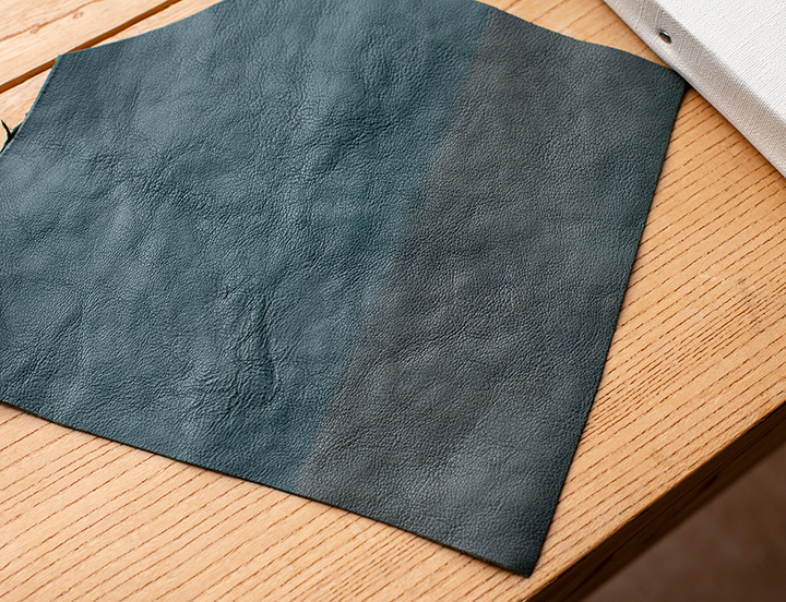 写真は、右側の1/3程度だけに日光を当てて経年変化を進めた革です。このようにグリーンは少しずつ青みが抜けていき、より落ち着いた色へと変化していきます。