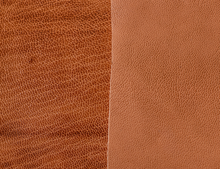 右はインド原皮のゴートで「フレスコ」に使っている革です。特徴は、きめが細かく一つひとつが四角く際立った“つぶシボ”であること。パキスタン原皮とはまた異なる上品さが漂います。