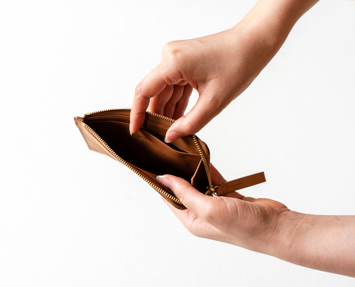 小銭は、L字ファスナーを開けて中へ。両サイドには仕切りがあり、二つ折りにしたお札がすっきり収まるサイズに仕上げてあります。