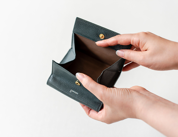 全体的に薄さを保ちつつも、小銭入れは片マチを付けることで中が見やすいよう工夫しています。角の仕上げが直線的ですが、シャープになりすぎないデザインで、ほのかな女性らしさが香ります。