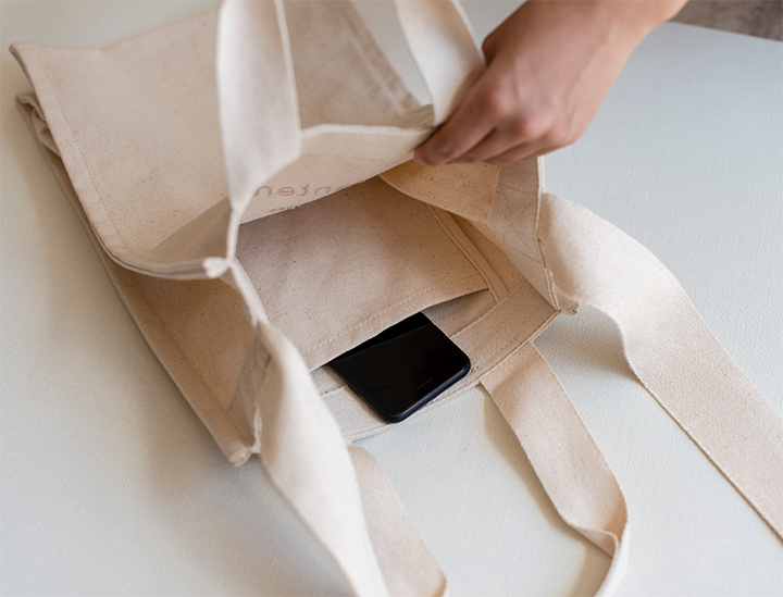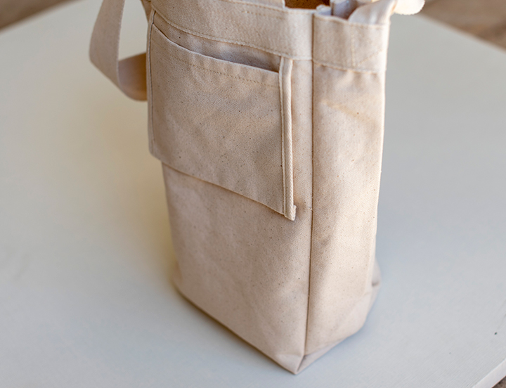 しっかりとした厚みのある生地。口の内側にはハンドルと同じテープをぐるりと配し、耐久性を上げています。スマートフォンやハンカチなどの収納に便利な吊りポケットで使い勝手よく。