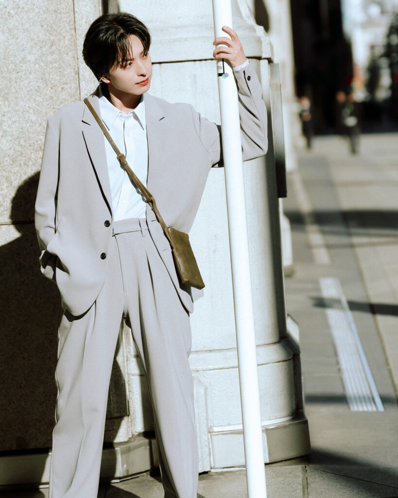 ジャケット¥48,400・シャツ¥31,900・パンツ¥46,200(すベてATTACHMENT/Sakas PR)、イヤーカフ[右耳]¥12,100(Jouete)、[左耳]¥4,950(and cloud)、その他/スタイリスト私物