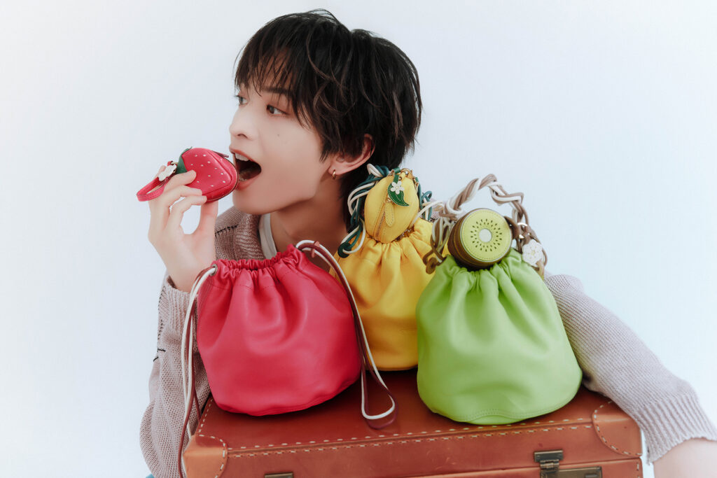 「ショルダーバッグは、あまりの軽さにびっくりしました。何も入っていない状態だと、指一本でも持てちゃうくらい軽いんです。荷物が重いのが苦手な方はぜひ一度持ってみてほしいです。カラフルな巾着やフルーツチャームは全種類コンプリートしたら、その日の気分に合わせて選べて楽しそうですよね。ちなみに僕は、黄緑の巾着×苺のフルーツチャームの組み合わせが好きです」