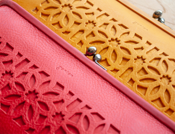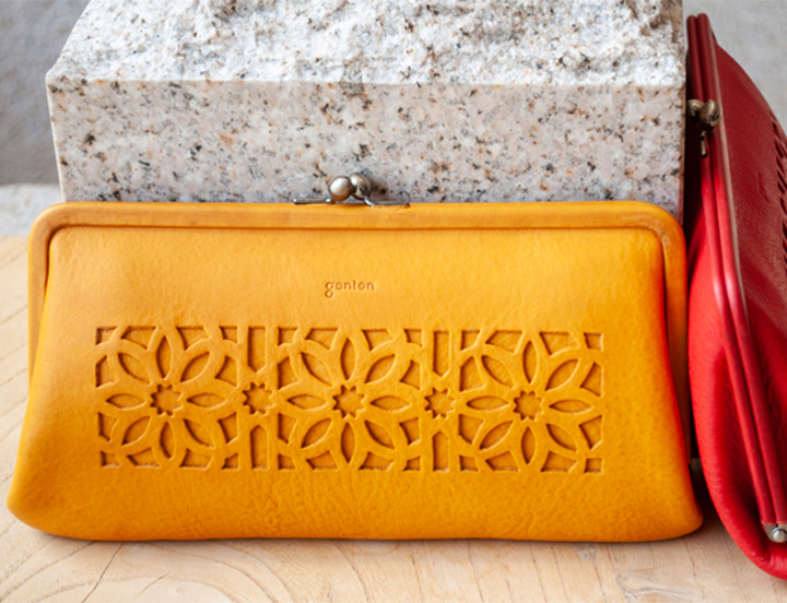 gentenならではのカットワークを配した口金長財布。もともとは2017年の仙台店のオープン1周年記念として限定色・数量限定で販売したものです。多くのお客様から「もう一度販売して欲しい」というお声をいただき、再び皆様にお届けできることになりました。今回は新色の赤とイエローをご紹介します。