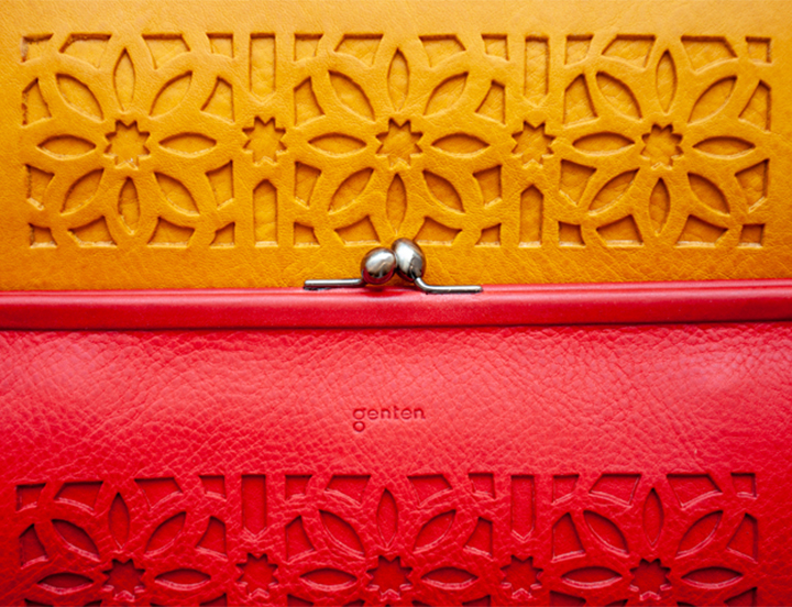 地中海沿岸の家や調度品などに使われる伝統的な意匠がモチーフとなり、花と星を表している「カットワーク」。これは、職人が金型を組み合わせ、調整しながらひとつひとつ革から抜き出す手仕事から生まれる、gentenを象徴するロングセラーです。