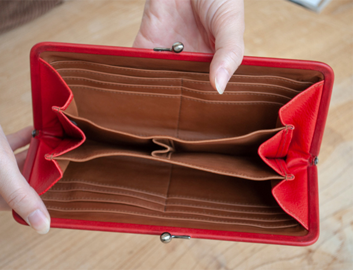 立体的なマチの構造で大きく開くので、お札、小銭、カードなどの中身が一目で見渡すことができて、取り出しやすいのもポイント。内側もすべて牛革製で丈夫にできているので、長く愛用していただけます。