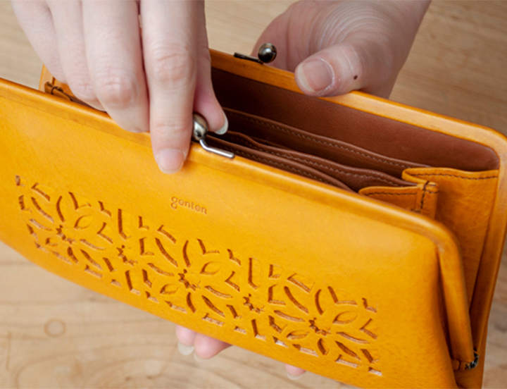 gentenで長年、愛されているデザインと形の2つを合わせたのが、このカットワークの口金長財布です。型抜きをする表側の革と、内側の革の2枚を重ねたつくりになっています。