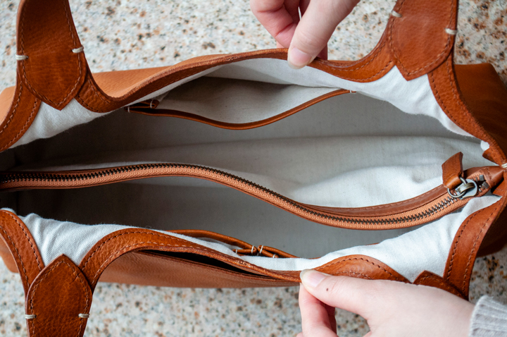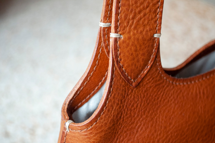 シンプルなデザインだからこそ、随所に職人の技が光る「トスカ」。ハンドル部分にも、職人の技が感じられるポイントが。本体とつないだ付け根のところに施した「トスカ」らしいステッチは、見た目のアクセントだけでなく、ミシン目と垂直の縫い目を入れることで、より強度を高めています。