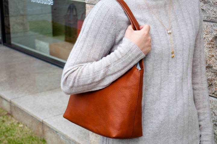 ハンドルは、いずれもコートを着ていても肩掛けができる長さに調整しました。使えば使うほど体のラインになじむ、しっとりとした革質はミネルバボックスならではです。