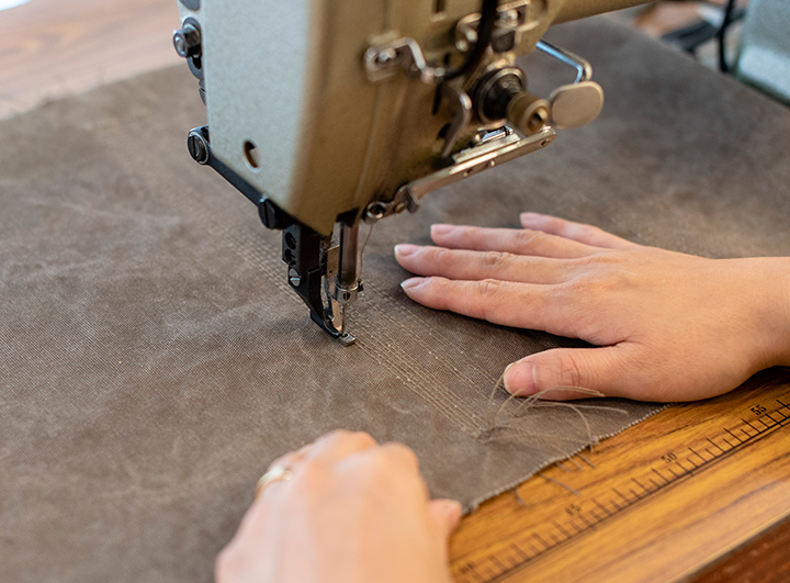 縫製はタイの職人の手によって行われています。ミモザ・ベーシックの表情を決める、ステッチ。よく見ると縫い目は一定ではありません。ゆらぎのある天然の色との相性を考え、手仕事の温もりを感じるステッチを施しました。ミシンの糸調子を整えながら、丁寧に縫っています。
