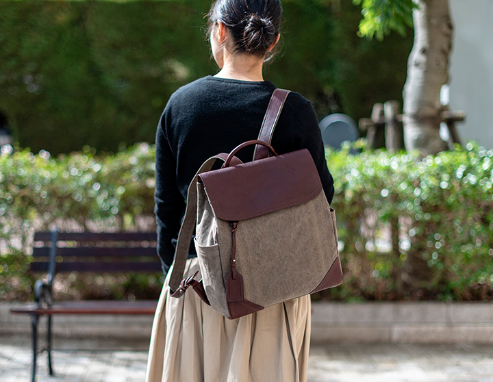 布×革のバッグですので、防水スプレーを使用すると雨の日も安心してお使いいただけます。本体部分はミモザと栗のタンニンで染めた生地だからこそ、革と同じように経年変化が楽しめます。