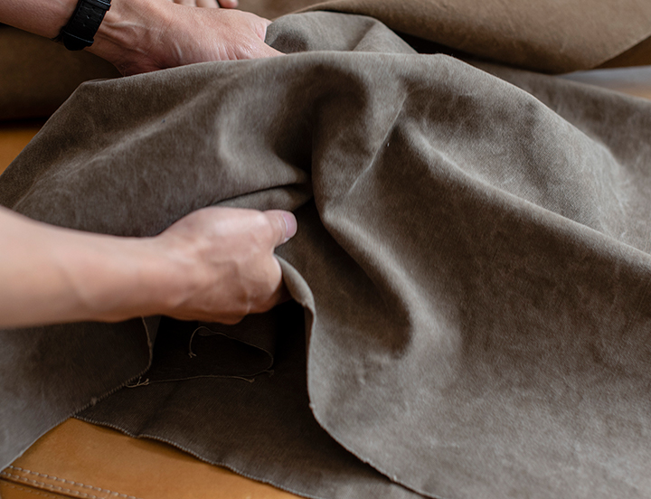 ミモザ・ベーシックの絶妙な色のさじ加減を担っているのは、京都の熟練した職人。京都・伏見の近くの染工場で清らかな地下水を使って染めています。「地下水の恩恵が美しい仕上がりにつながっている」と長年タンニン染めに携わる、渡部さんは言います。
