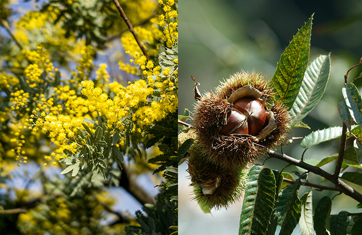 春に黄色の花弁をつける「ミモザ」と英語でチェスナットと呼ばれる「栗」。一見すると、ミモザの花弁や栗の実から染色するように思えますが、実はそれぞれの樹皮からとれるタンニンで染めています