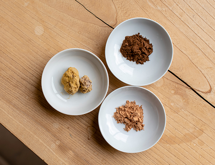 「ミモザ・ベーシック」で使われている染料の粉末。左から時計回りに鉄(硫酸鉄)、チェスナット、ミモザ。