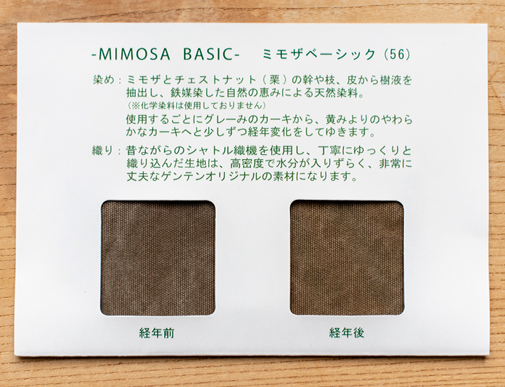 gentenのミモザ・ベーシックは植物染めによる「自然」の風合いを存分に味わっていただけるシリーズ。定番色の「チャ」はその名の由来ともなっている「ミモザ」と「チェスナット(栗)」で生地を染めています。「ノウチャ」はそこに鉄を加えて色を変化させたものです。日本では昔から「鉄釘」を植物染めの色止めとして用いており、その知恵を活かしました。